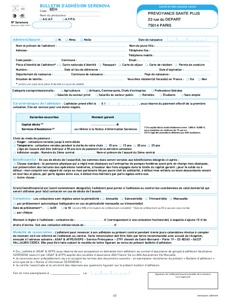 BULLETIN ADHESION SERENOVACachet de vote assurer conseil8EH Code : ............................................................... Not Du producer : ....................................... A.S.A.F.