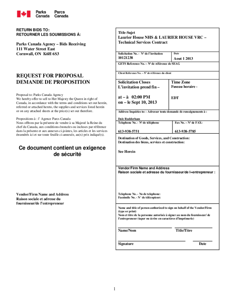RETURN BIDS TO: RETURNER LES COMMISSIONS :TitleSujetLaurier House NHS & LAURIE HOUSE ARC Technical Services Contract Parks Canada Agency Bids Receiving 111 Water Street East Cornwall, ON K6H 6S3Solicitation