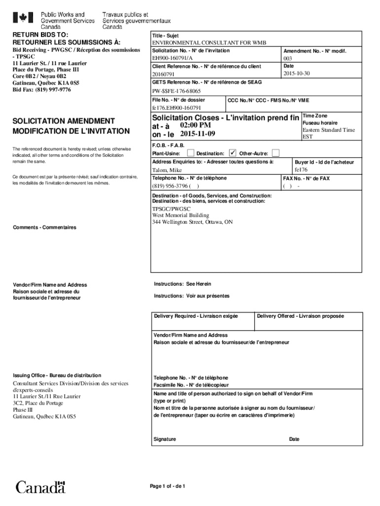 11RETURN BIDS TO: RETURNER LES COMMISSIONS :Title Outbid Receiving PW GSC / Reception DES sou missions TP SGC 11 Laurie St. / 11 rue Laurie Place du Portage, Phase III Core 0B2 / Royal 0B2 Gatineau,
