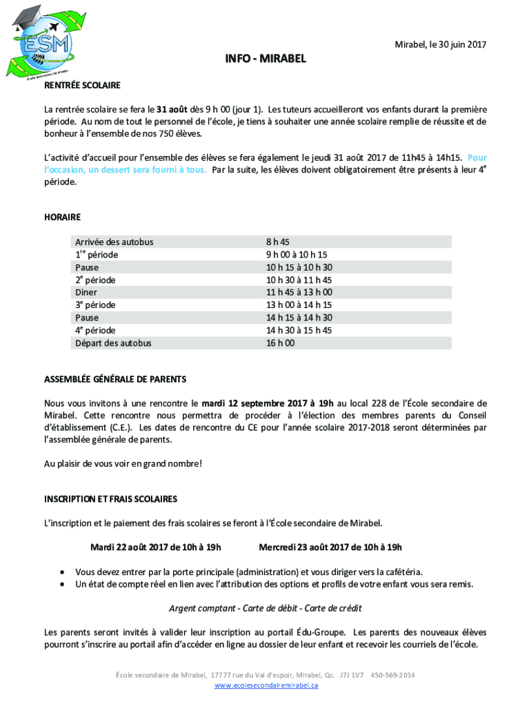 INFO MIRABELMirabel, LE 30 join 2017RENTRE CLAIRE La renter Claire SE fer ale 31 AOT DS 9 h 00 (four 1). Les auteurs accueilleront Los infants Durant la premiere pride. Au not DE tout LE personnel