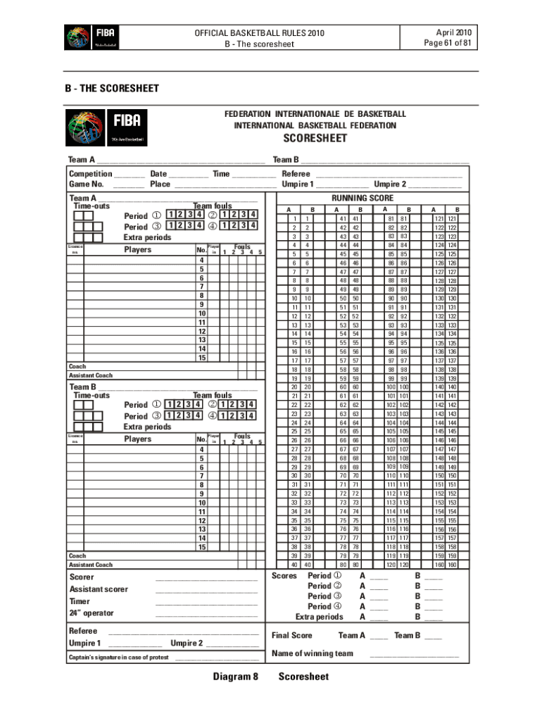 April 2010-Page 61 of 81OFFICIAL BASKETBALL RULES 2010 B The scoresheet FEDERATION INTERNATIONALE DE BASKETBALL INTERNATIONAL BASKETBALL FEDERATIONSCORESHEET Team A ___ Team B ___ Competition ___