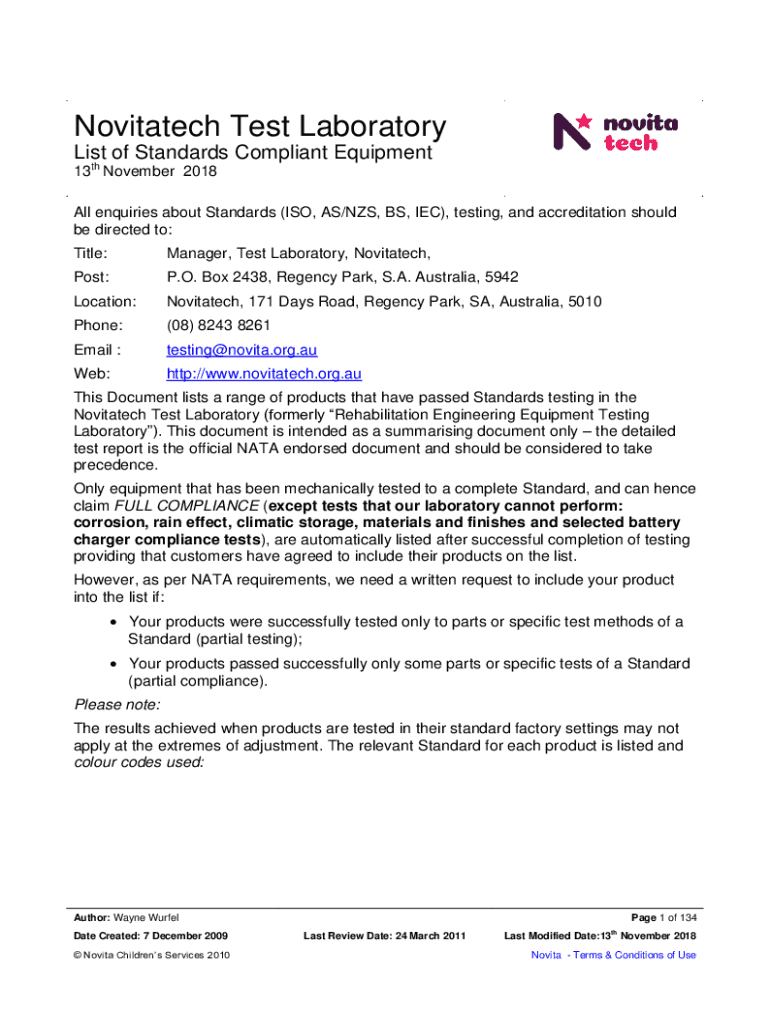 Novitiate Test Laboratory List of Standards Compliant Equipment 13th November 2018All inquiries about Standards (ISO, AS/NHS, BS, IEC), testing, and accreditation should be directed to: Title:Manager,