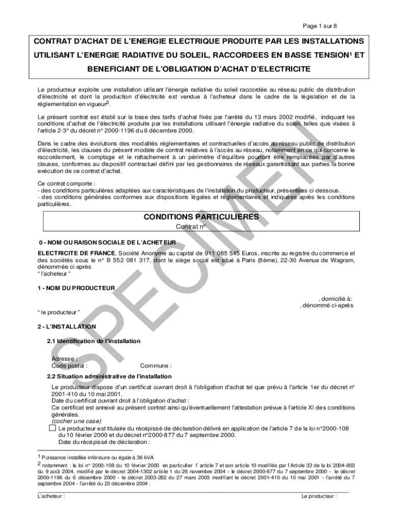 Page 1 SUR 8CONTRAT D\'CHAT DE L\'ENERGIES ELECTRIC PRODUCE PAR LES INSTALLATIONS MILITANT ENERGIES RADIATIVE DU SOLE IL, ACCORDED EN BASE TENSION1 ET BENEFICIAL DEL OBLIGATION DACHAU ELECTRICITY