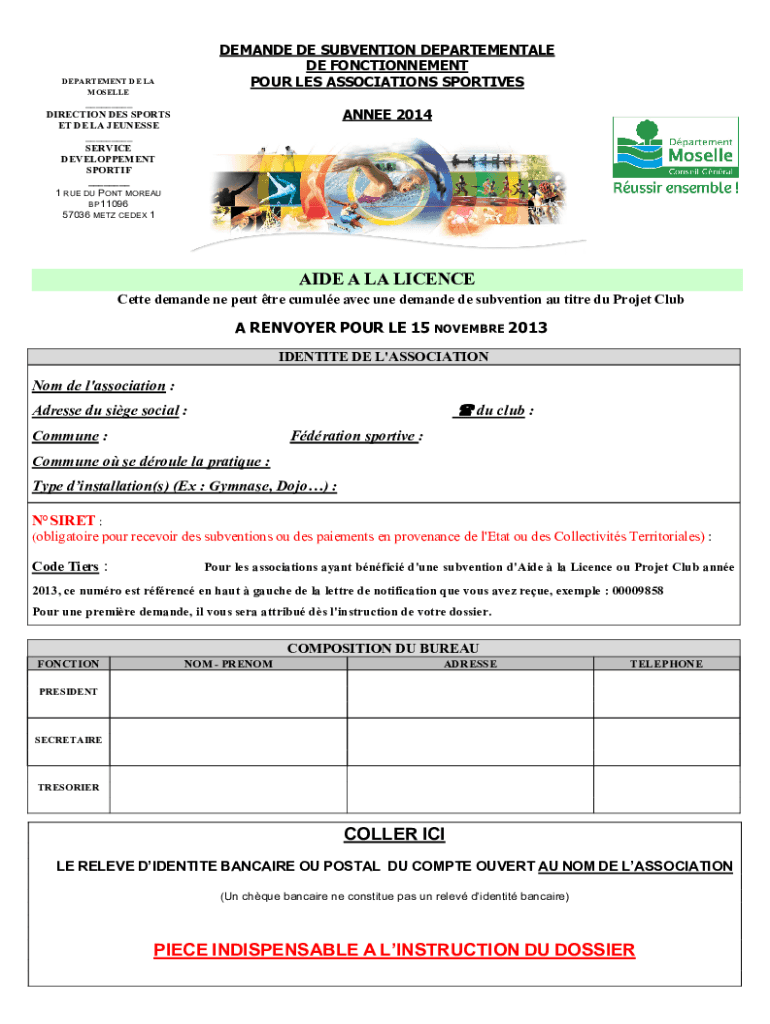 DEMAND DE SUBVENTION DEPARTMENTAL DE FONCTIONNEMENT POUR LES ASSOCIATIONS SPORTIVESDEPARTEMENT DE LA MOSELLE___ DIRECTION DES SPORTS ET DE LA TENNESSEE ___ SERVICE DEVELOPMENT SPORT IF ___ 1 RUE DU