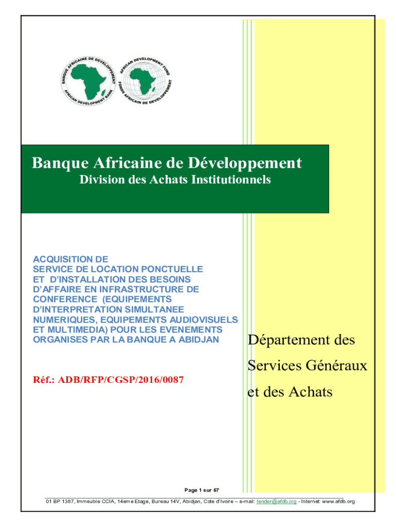 Banquet African de Dveloppement Division DES Chats InstitutionnelsACQUISITION DE SERVICE DE LOCATION PUNCTUALLY ETD INSTALLATION DES BEGINS AFFAIRS EN INFRASTRUCTURE DE CONFERENCE (EQUIPMENTS INTERPRETATION