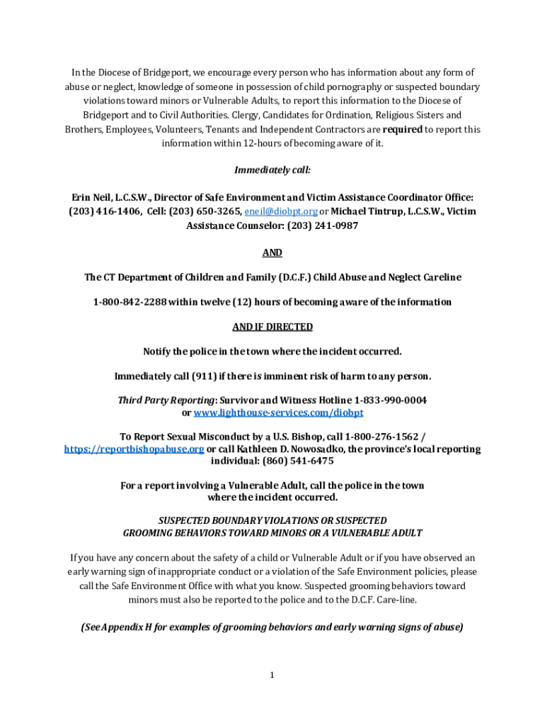 In the Diocese of Bridgeport, we encourage every person who has information about any form of abuse or neglect, knowledge of someone in possession of child pornography or suspected boundary violations