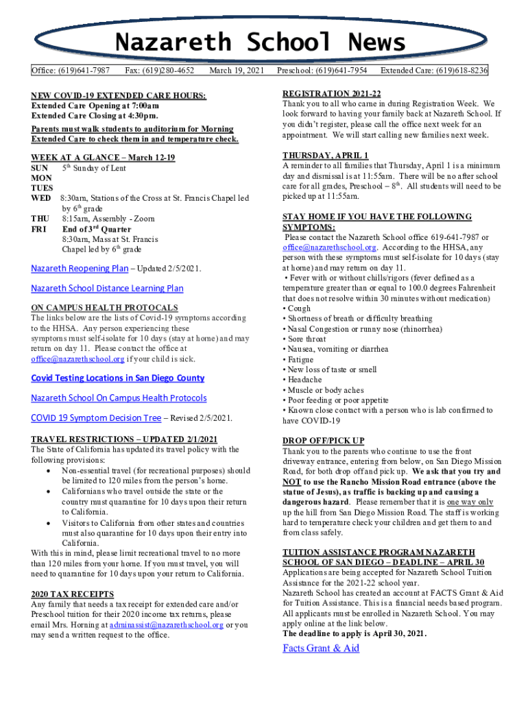 Nazareth School News Office: (619)6417987Fax: (619)2804652NEW COVID-19 EXTENDED CARE HOURS: Extended Care Opening at 7:00am Extended Care Closing at 4:30pm. Title March 19, 2021Parents must walk students