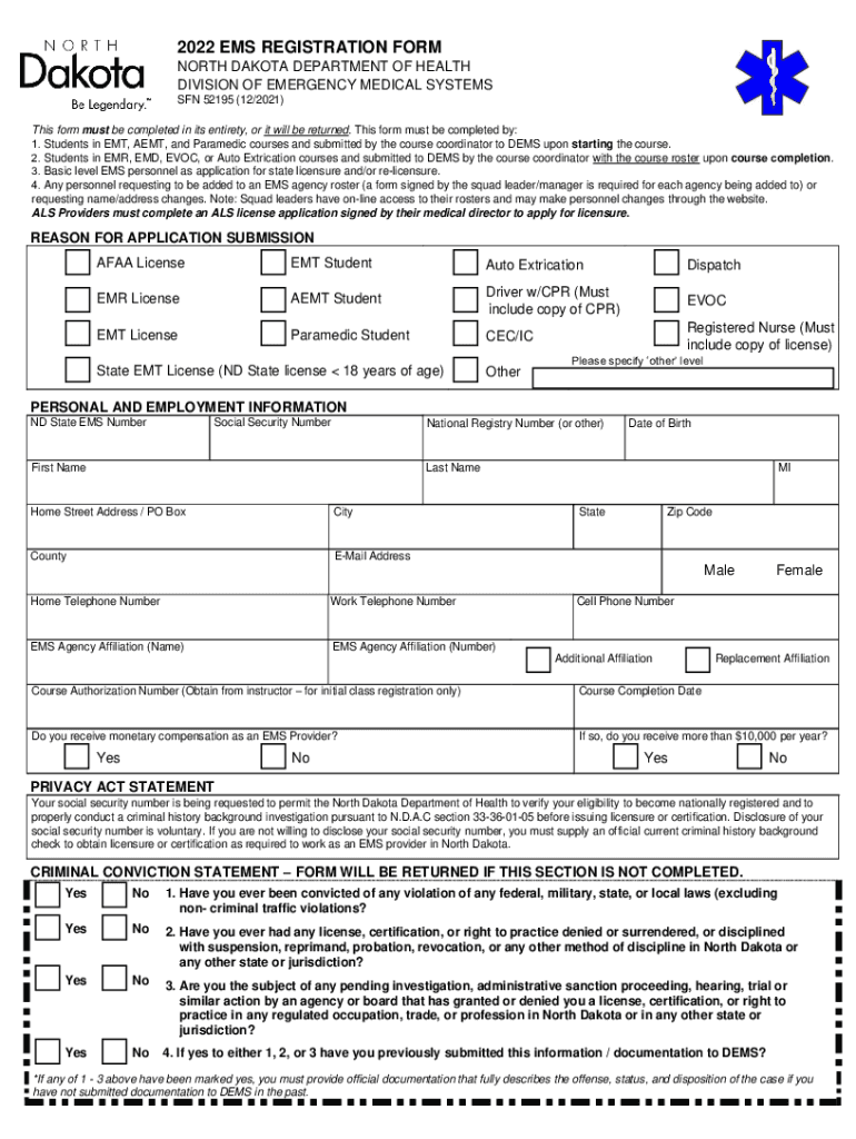2022 EMS REGISTRATION FORM NORTH DAKOTA DEPARTMENT OF HEALTH DIVISION OF EMERGENCY MEDICAL SYSTEMS SON 52195 (12/2021) This form must be completed in its entirety, or it will be returned. This form
