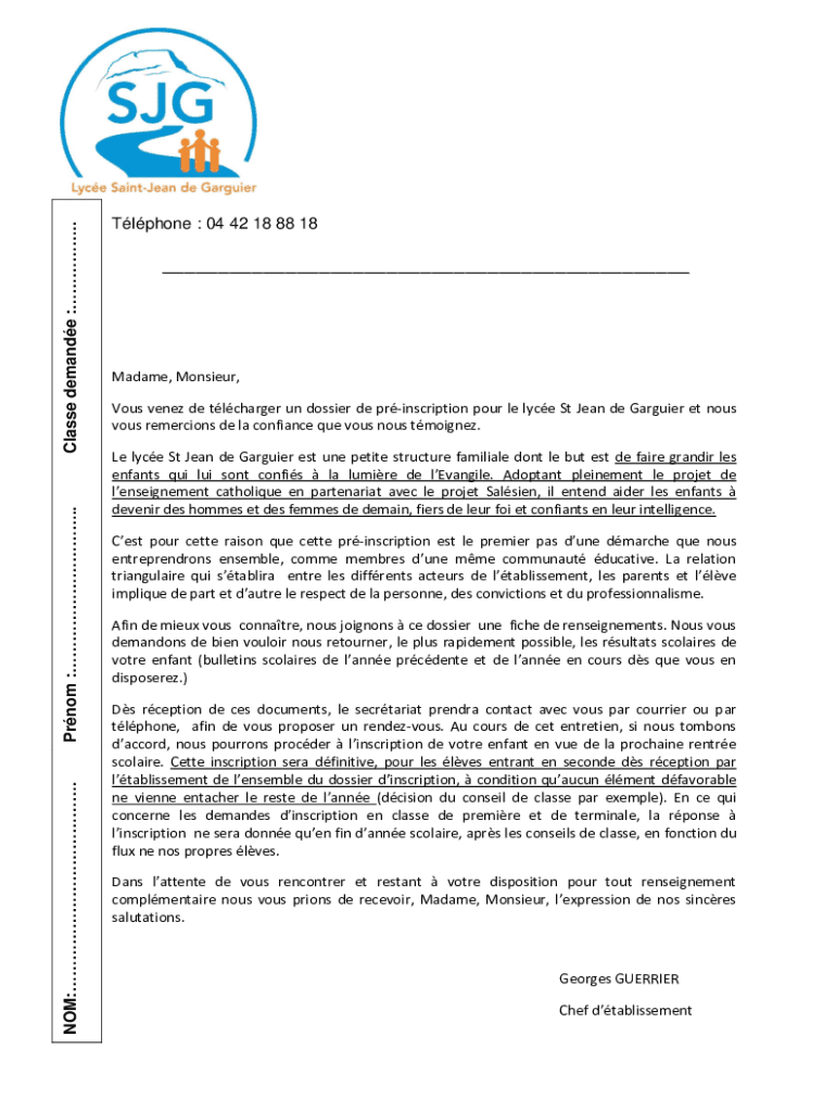 Class demand :. Prom :. NOT:. Tl phone : 04 42 18 88 18___Madame, Monsieur, Vows Velez de charger UN dossier de pr inscription pour LE lace St Jean de Garguier et nous vows reversions DE la confiance