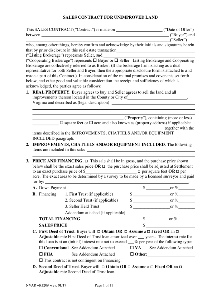 SALES CONTRACT FOR UNIMPROVED LAND This SALES CONTRACT (Contract) is made on between(Date of Offer) (Buyer) and (Seller) who, among other things, hereby confirm and acknowledge by their initials and