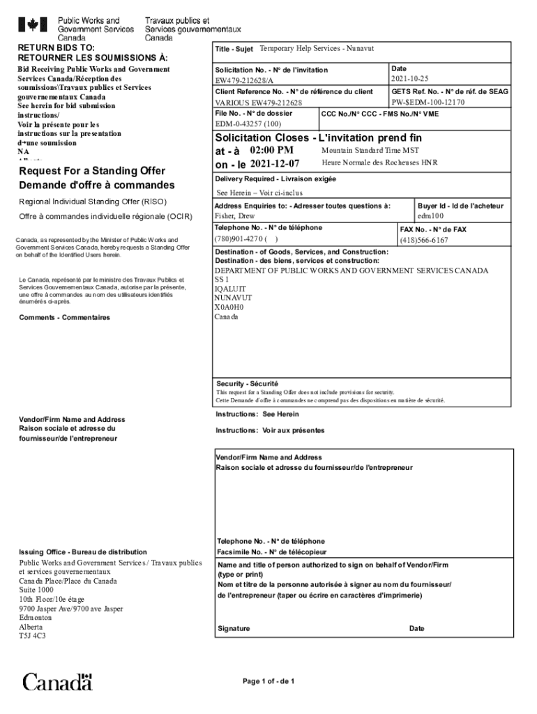 11RETURN BIDS TO: RETURNER LES COMMISSIONS :Title Suet Temporary Help Services Nunavut Receiving Public Works and Government Services Canada/Reception DES soumissionsTravaux public set Services gouvernementaux
