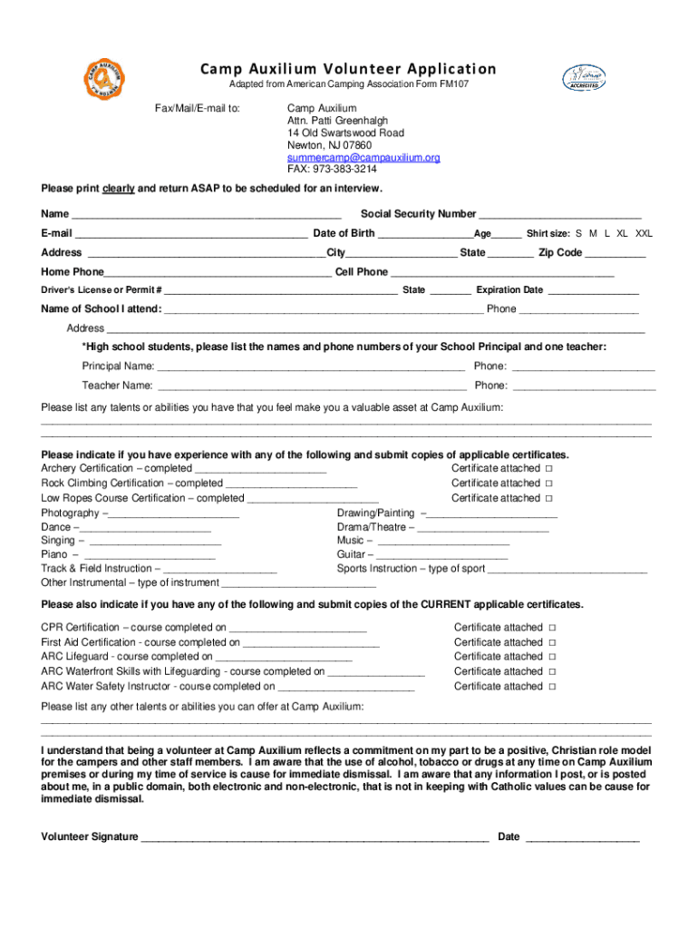Camp Aux ilium Volunteer Application Adapted from American Camping Association Form FM107Fax/Mail/Email to:Camp Aux ilium Attn. Patti Greenhall 14 Old Heartwood Road Newton, NJ 07860 summercamp@campauxilium.org