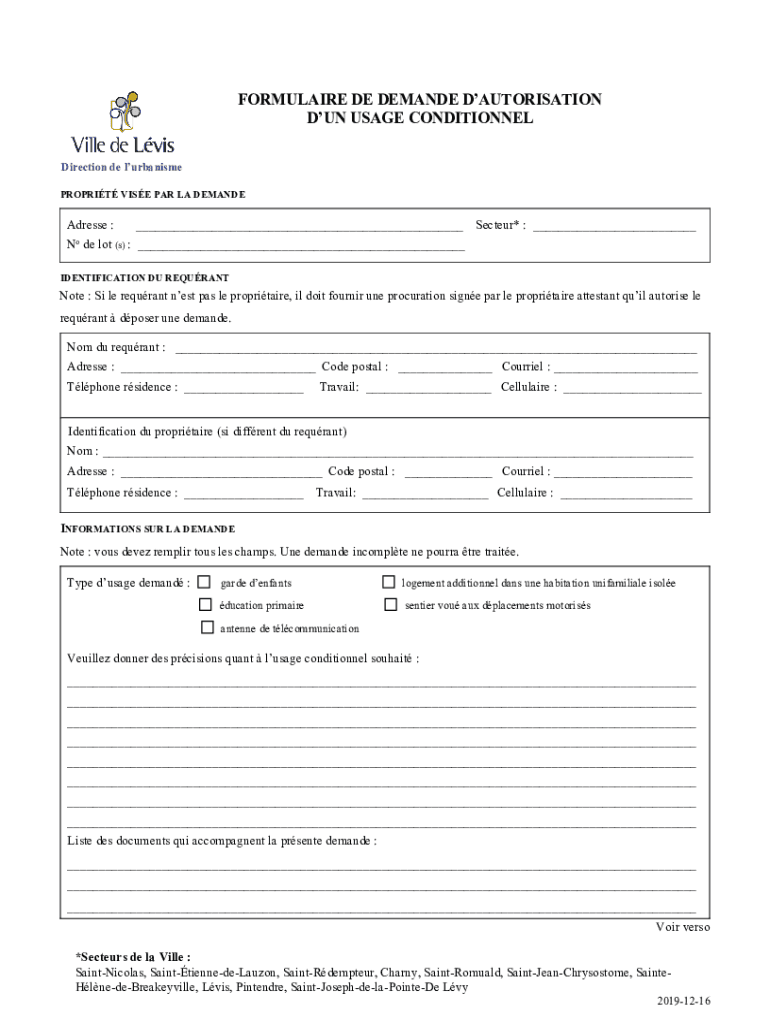 FORMULA IRE DE DEMAND AUTHORIZATION DUN USAGE CONDITIONAL Direction DE urbanism PROFIT VISE PAR LA DEMANDEAdresse :___ Sector* : ___N de lot (s) : ___ identification DU REQURANTNote : Si LE return