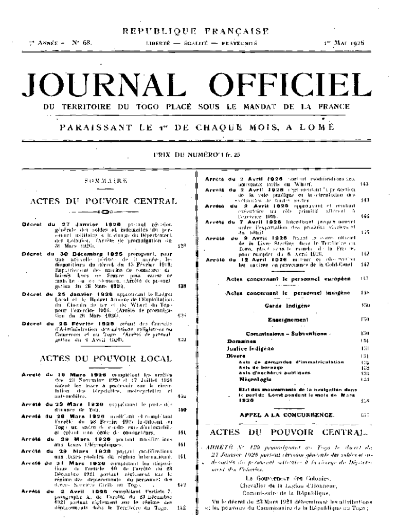 REPUBLIQUErN\' 68.ANNEFRANAISEiGALlT Albert:: FRATERNITJOURNAL OFFICIELDUTERRITOIREDUTOGOPLACSOUSLEMANDATDELAFRANCEPARAI S SAN TL Et e DE CLAQUE MOIST, AL 0 M April DU Numb:RO\' 1 fr. 25t; () :Diary