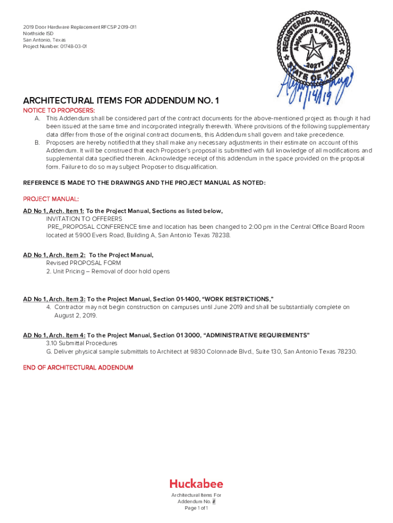 2019 Door Hardware Replacement RFCs 2019011 Northside ISD San Antonio, Texas Project Number: 017480301ARCHITECTURAL ITEMS FOR ADDENDUM NO. 1 NOTICE TO PROPOSERS: A. This Addendum shall be considered