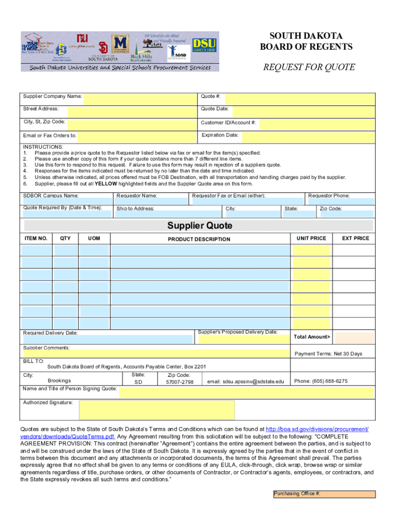 SOUTH DAKOTA BOARD OF REGENTS REQUEST FOR QUOTE Supplier Company Name:Quote #:Street Address:Quote Date:City, St, Zip Code:Customer ID/Account #:Email or Fax Orders to:Expiration Date:INSTRUCTIONS: