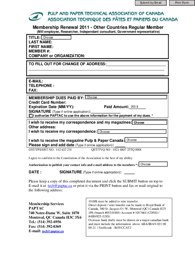 Submit by EmailMembership Renewal 2011 Other Countries Regular Member (Mill employee, Researcher, Independent consultant, Government representative)TITLE: Choose LAST NAME: FIRST NAME: MEMBER #: COMPANY