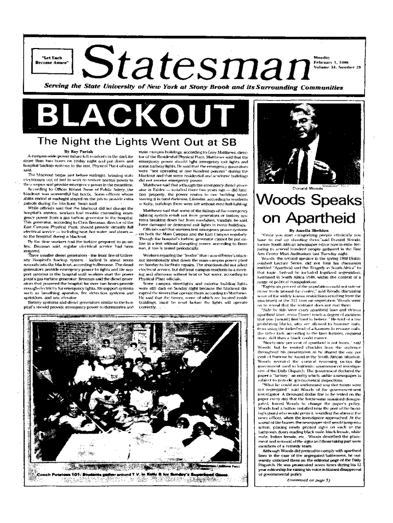 X_1an L, + _Become Aware\'\'1 t×Saco1tFebruar1, 198WIher 29d1it 1Serving the State University of New York at Stony Brook and its Surrounding Communities The Night the Lights Went Out at SB By Ray