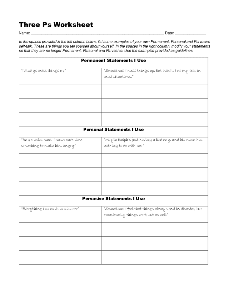 Three PS Worksheet Name: ___ Date: ___ In the spaces provided in the left column below, list some examples of your own Permanent, Personal and Pervasive self talk. These are things you tell yourself