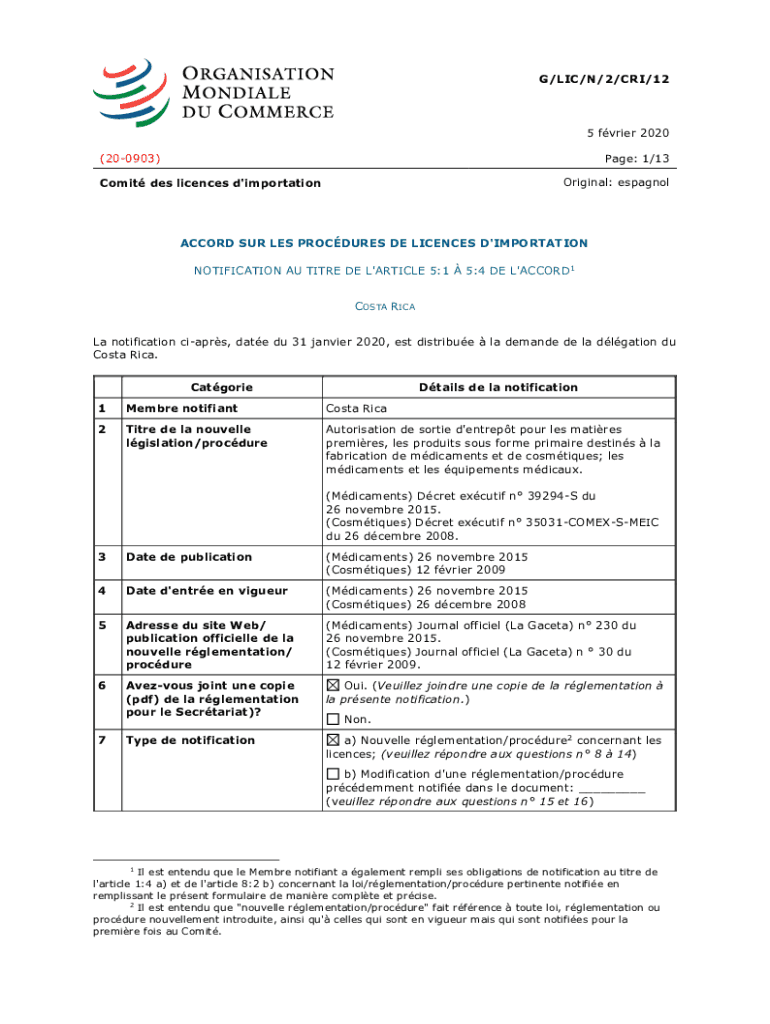 G/LIC/N/2/CRY/125 frier 2020 (200903)Page: 1/13 Original: espagnolComit DES licenses d\'importationACCORD SUR LES PROCEDURES DE Licenses D\'IMPORTATION NOTIFICATION AU TITLE DE L\'ARTICLE 5:1 5:4