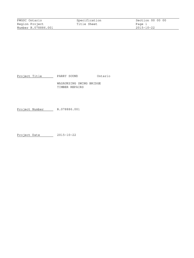 PW GSC Ontario Region Project Number R.078886.001Project TitleSpecification Title SheetPARRY SOUNDOntarioWASAUKSING SWING BRIDGE TIMBER REPAIRSProject Number.078886.001Project Date20151022Section