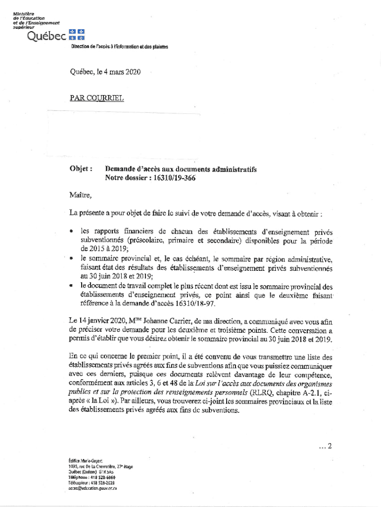 Minister de l\'education et de enslavement suprieurQubec Direction de l\'acts l\'information et DES plaintesQubec, LE 4 Mars 2020PAR COURRIELObjet:Demanded\'acts aux documents administration Note