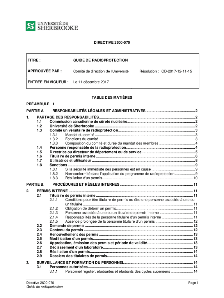 DIRECTIVE 2600070TITRE :GUIDE DE RADIOPROTECTIONAPPROUVE PAR :Comic DE direction de lUniversitENTRE EN LIQUEUR :Le 11 December 2017Rsolution : CD2017121115TABLE DES MATURES PREAMBLE 1 PARTIES A. 1.RESPONSIBILITY