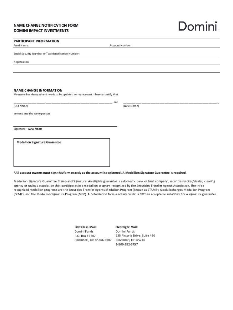NAME CHANGE NOTIFICATION FORM DOMINIC IMPACT INVESTMENTS PARTICIPANT INFORMATION Fund Name:Account Number:Social Security Number or Tax Identification Number: Registration:NAME CHANGE Information