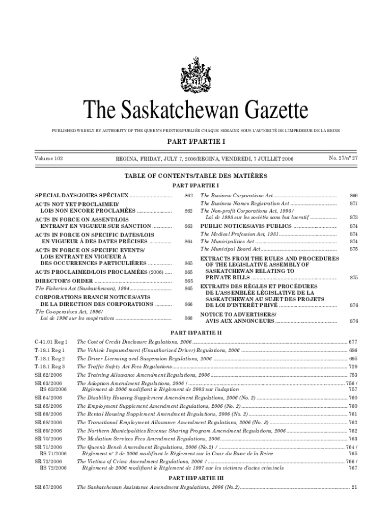 THE SASKATCHEWAN GAZETTE, JULY 7, 2006861The Saskatchewan Gazette PUBLISHED WEEKLY BY AUTHORITY OF THE QUEENS PRINTER/PUBLIC CLAQUE REMAINED SOUS AUTOFIT DE IMPRIMATUR DE LA REINHART I/PARTIES I Volume