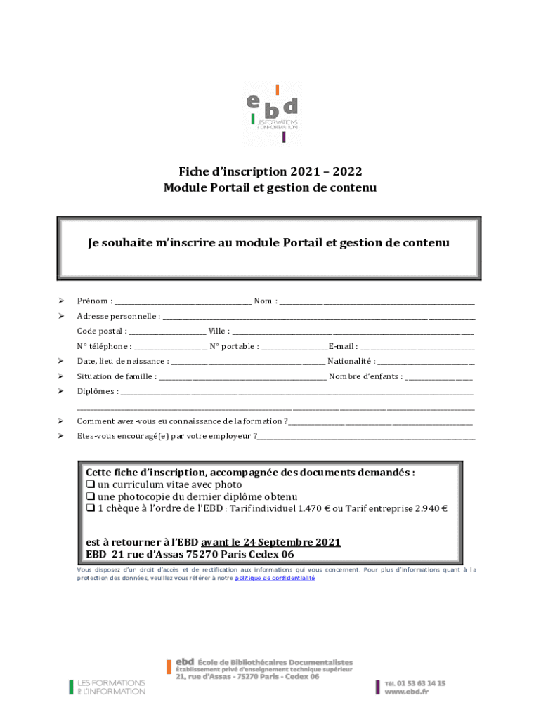 Get the free Fiche d'inscription 2021 2022 Module Portail et gestion de ... - EBD