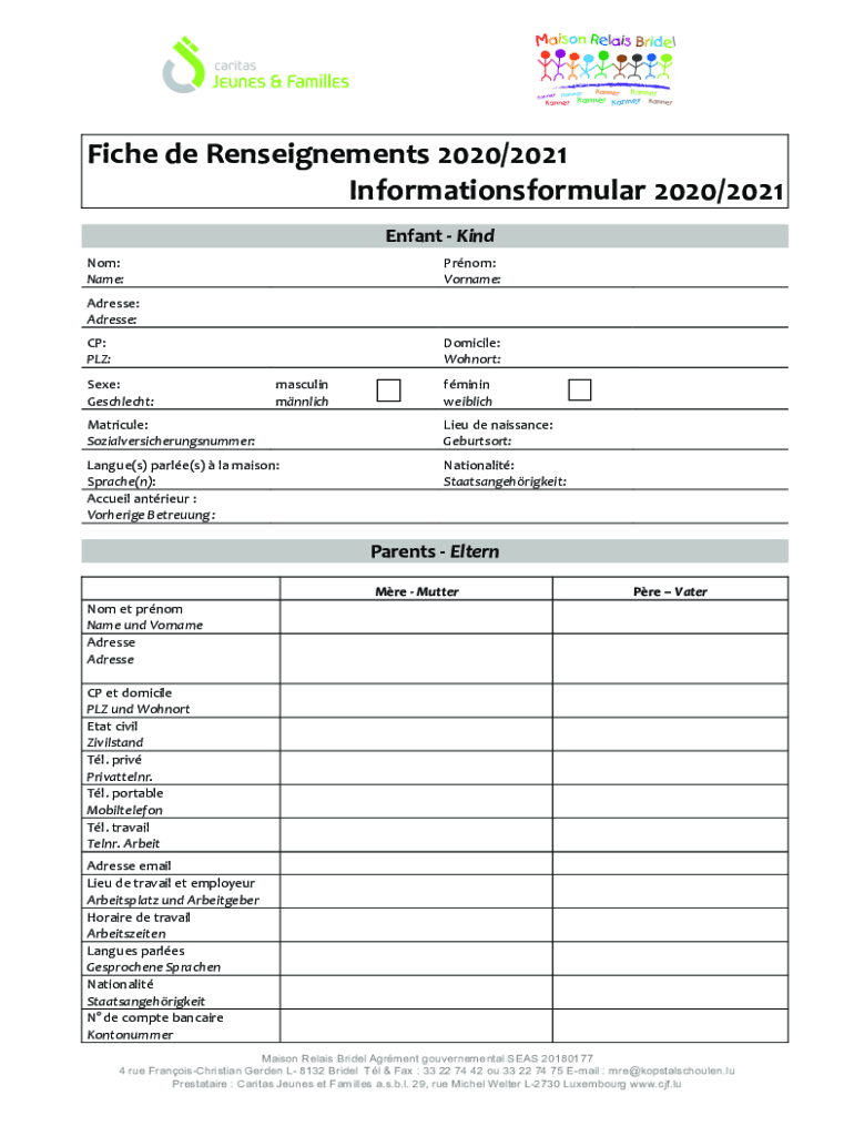 Fiche de Renseignements 2020/2021 Informationsformular 2020/2021 Enfant Kind Not: Name:Prom: Surname:Address: Address: CP: PLY:Domicile: Cohort:See: Geschlecht:masculine mnnlichfminin weiblichMatricule:
