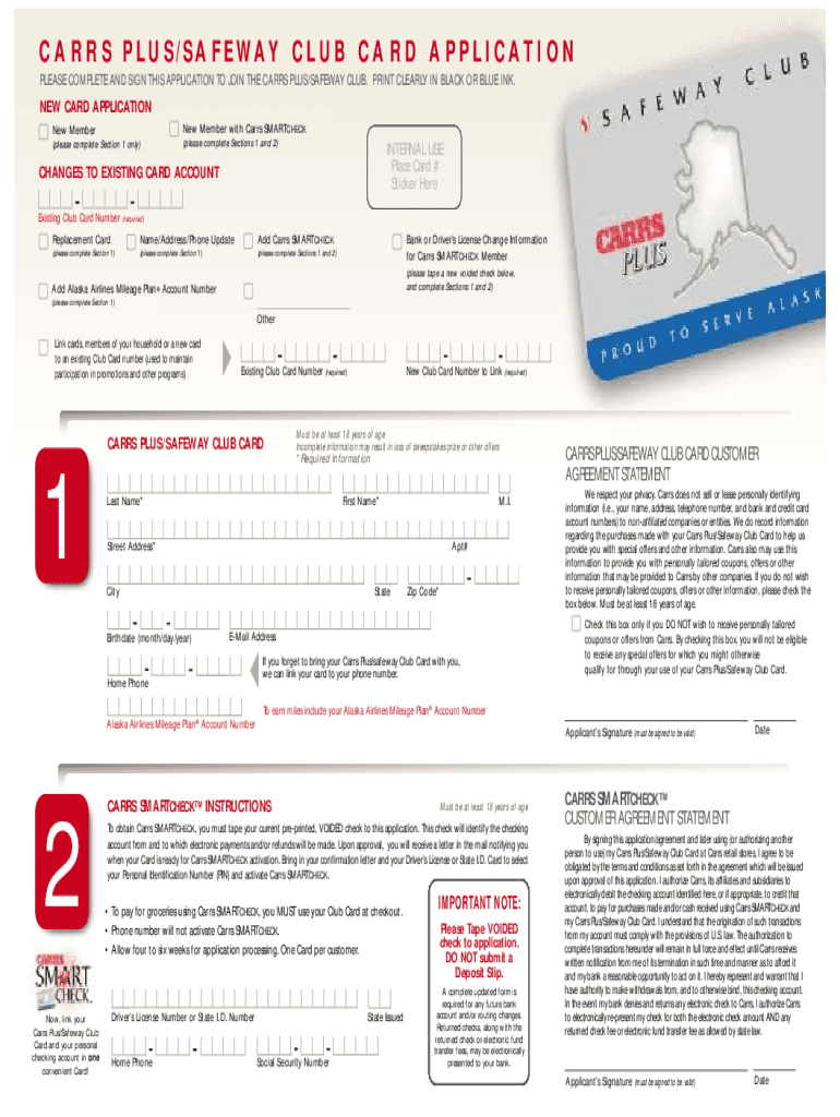 C A R R S P L U S/ SA F E W A Y C L U B C A R D A P P L I C A T I O N PLEASE COM PLATE AND SIGN THIS APPLICATION TO JOIN THE CARS PLUS/SAFEWAY CLUB. PRINT CLEARLY IN BLACK OR BLUE INK.NEW CARD APPLICATION