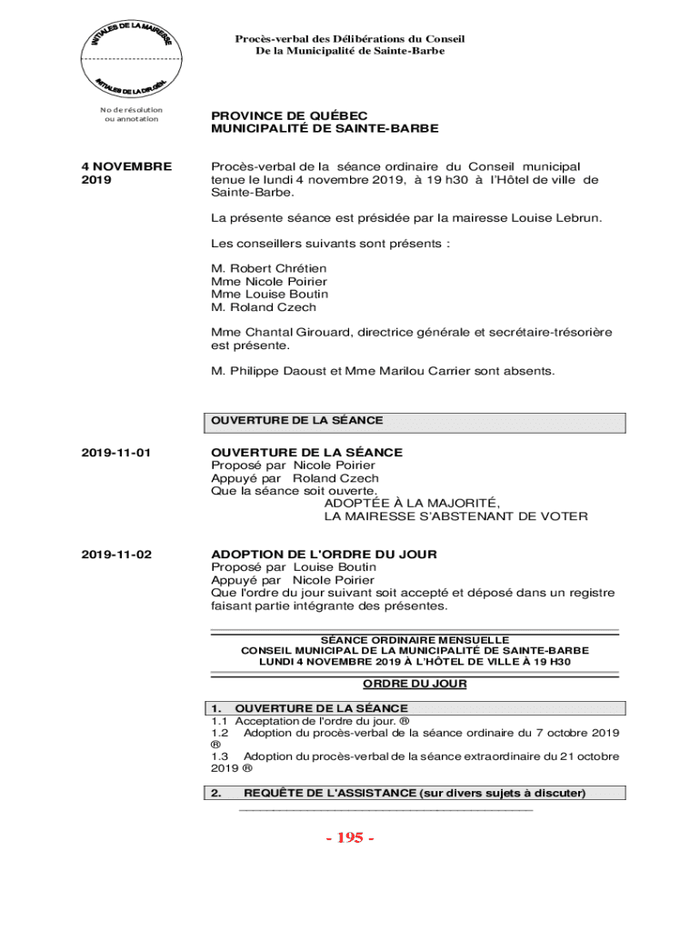 Procès-verbal DES Vibrations du Conrail De la Municipality de SainteBarbeNo de solution of annotation4 NOVEMBER 2019PROVINCE DE QUEBEC MUNICIPALITY DE SAINTEBARBE Procès-verbal DE la since ordinary