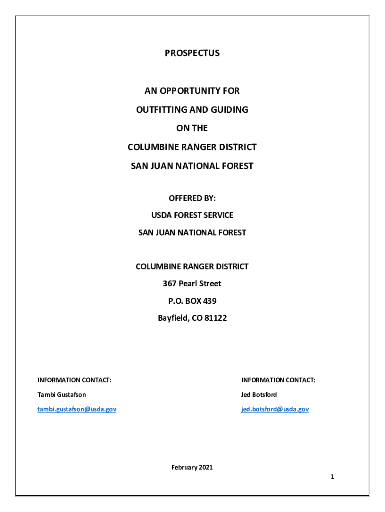 PROSPECTUS AN OPPORTUNITY FOR OUTFITTING AND GUIDING ON THE COLUMBINE RANGER DISTRICT SAN JUAN NATIONAL FOREST OFFERED BY: USDA FOREST SERVICE SAN JUAN NATIONAL FORESTCOLUMBINE RANGER DISTRICT 367