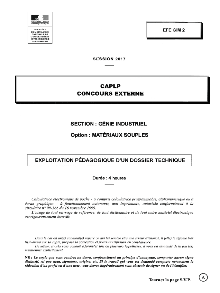 MINISTRY DE EDUCATION NATIONAL, DE LENSEIGNEMENT SPRIER ET DE LA RECHERCHESECTION : GENIE INDUSTRIAL Option : MATRIX SOUPLESTournez la page S.V.P.AEF HIM 2Documents remix : Suet Dossier technique