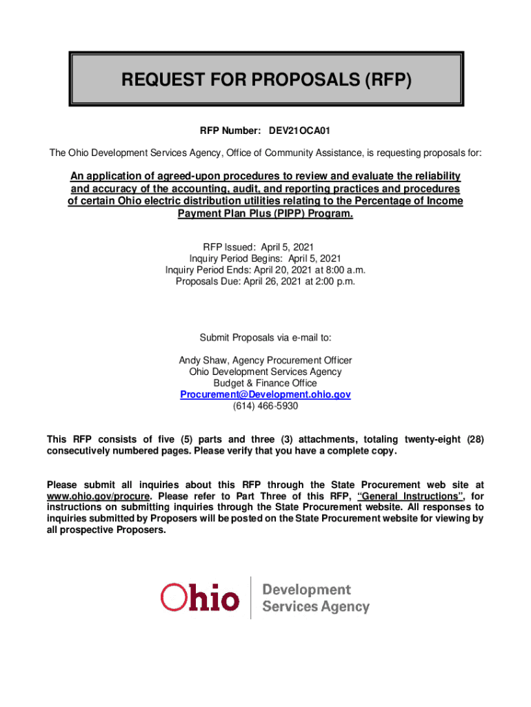 REQUEST FOR PROPOSALS (RFP) RFP Number: DEV21OCA01 The Ohio Development Services Agency, Office of Community Assistance, is requesting proposals for:An application of agreed upon procedures to review