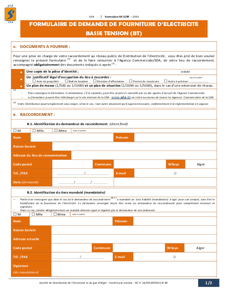 SDA| Formula ire OF. E/BT 2016FORMULAIRE DE DEMAND DE FURNITURE ELECTRICITY BASE TENSION (BT) A.DOCUMENTS A FOUR NIR :Pour one price en charge DE vote reinforcement AU Roseau public DE Distribution