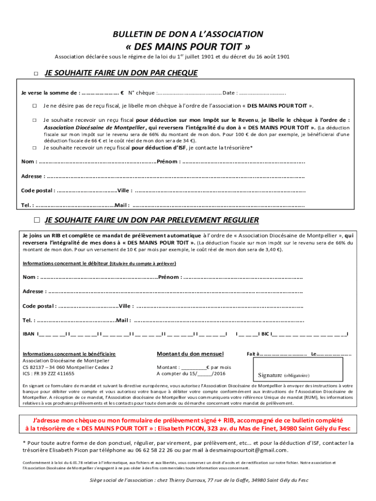 BULLETIN DE DON A ASSOCIATION DES MAINS POUR TORT Association clear sous LE regime DE la LOI Du 1er bullet 1901 et Du crew Du 16 AOT 1901 JE SUITE FAIR EUN DON PAR Cheese verse la Somme de :. N chose