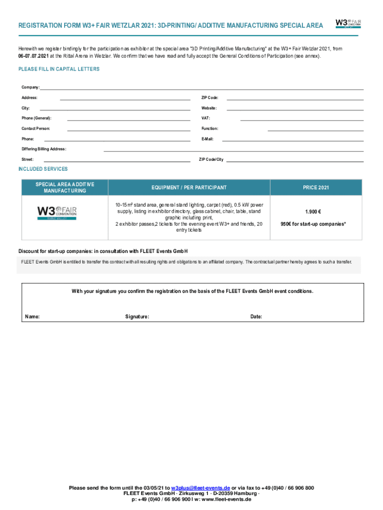 REGISTRATION FORM W3+ FAIR REGULAR 2021: 3DPRINTING/ ADDITIVE MANUFACTURING SPECIAL AREA Herewith we register blindingly for the participation as exhibitor at the special area \'3D Printing/Additive