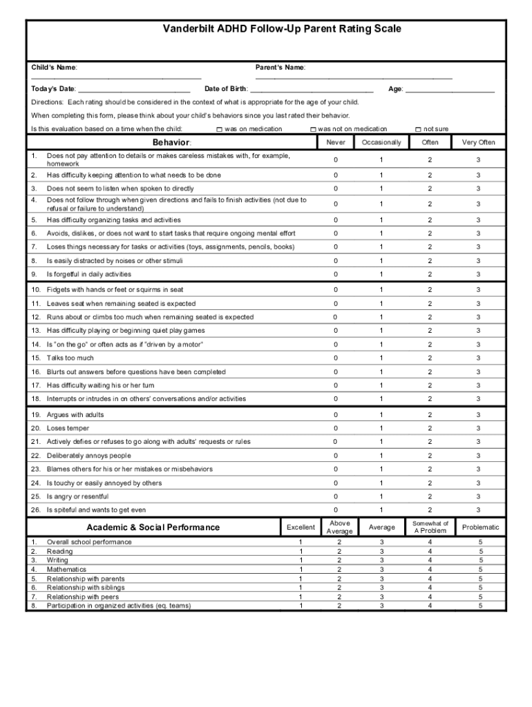 Vanderbilt ADHD Followup Parent Rating ScaleChilds Name: ___ Today's Date: ___Parents Name: ___ Date of Birth: ___Age: ___Directions: Each rating should be considered in the context of what is appropriate