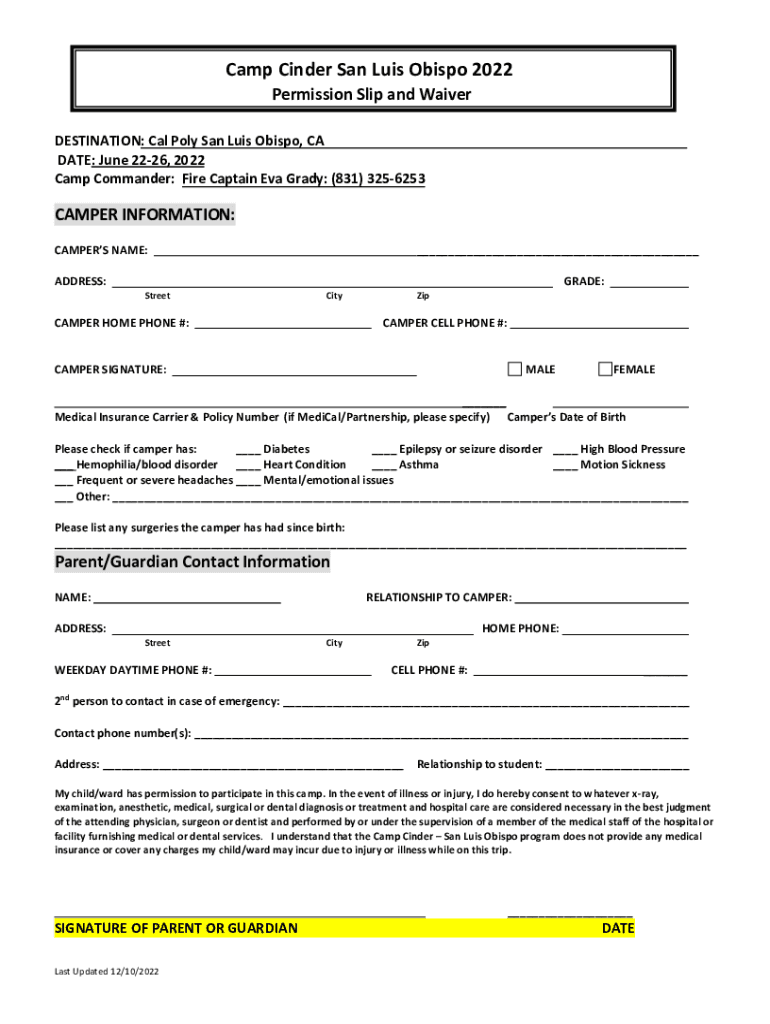 Camp Cinder San Luis Obispo 2022 Permission Slip and Waiver DESTINATION: Cal Poly San Luis Obispo, CA DATE: June 2226, 2022 Camp Commander: Fire Captain Eva Grady: (831) 3256253CAMPER INFORMATION: