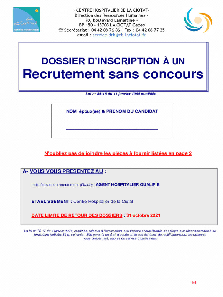 Center HOSPITALITY DE LA CIOTATDirection DES Resources Humans 70, boulevard Lamar tine BP 150 13708 LA CIO TAT CEDEX Secretariat : 04 42 08 76 86 Fax : 04 42 08 77 35 email : service.drh@chlaciotat.fr