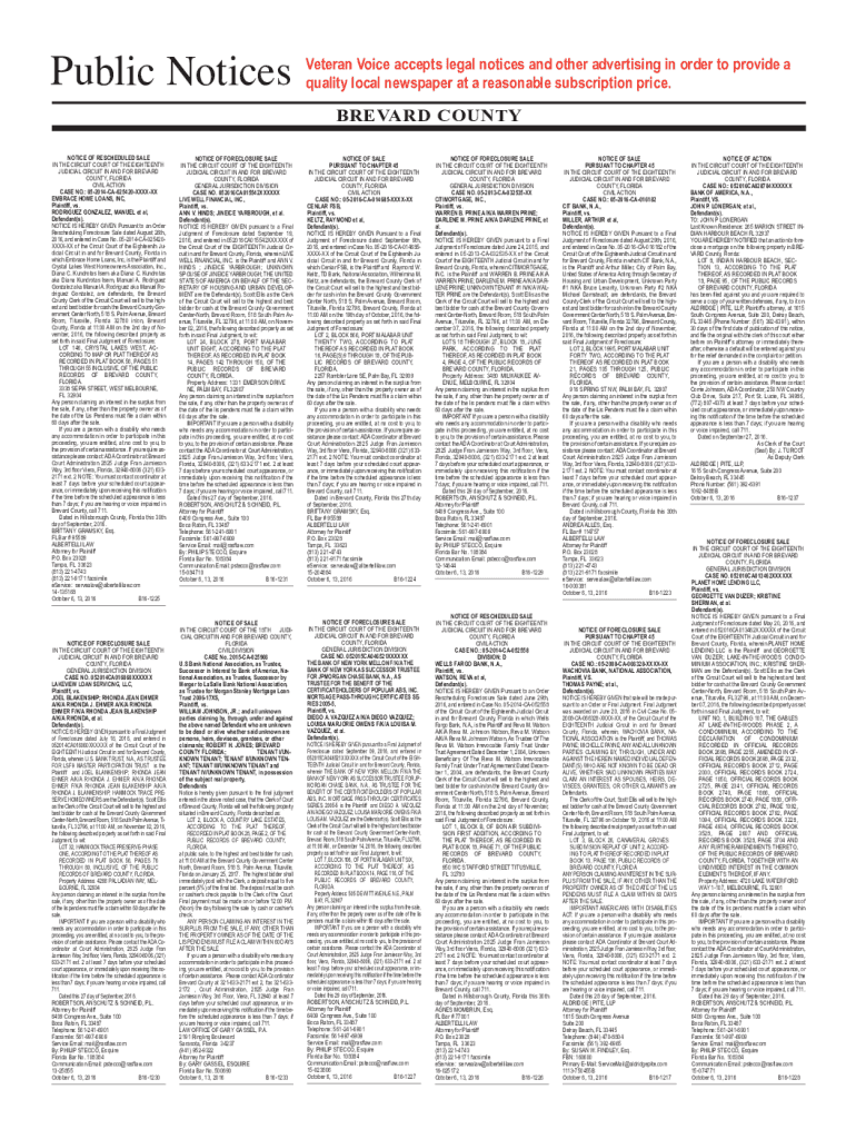 Public Notices veteran voice accepts legal notices and other advertising in order to provide a quality local newspaper at a reasonable subscription price. BREVARD COUNTY NOTICE OF Rescheduled SALE