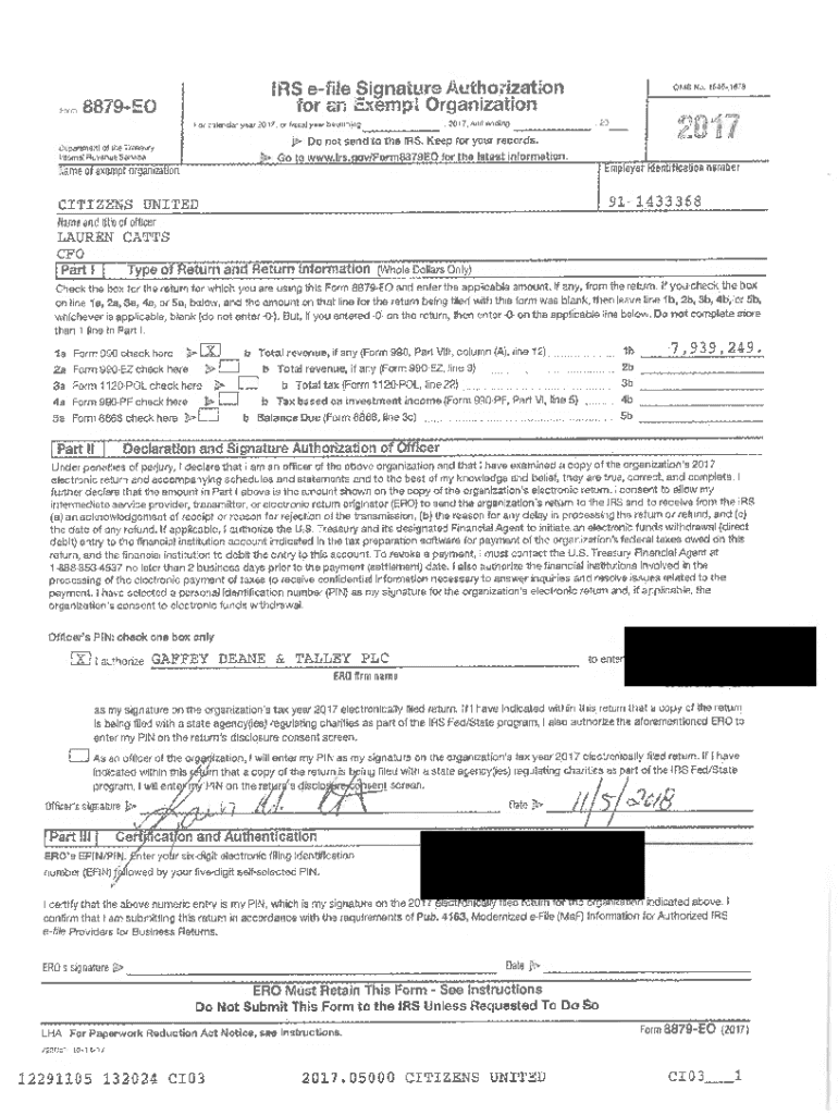 IRS file Signature Authorization for an Exempt Organization 8879* EO fottiiendar year 2017, or fiscal year Defining_ 2017, and ending&OLpartme^t of the Treasury Eternal Revenue Service 3Do not send