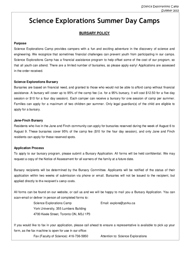 Science Explorations Camp Summer 2013Science Explorations Summer Day Camps BURSARY POLICY Purpose Science Explorations Camp provides campers with a fun and exciting adventure in the discovery of science