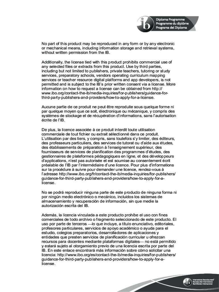 No part of this product may be reproduced in any form or by any electronic or mechanical means, including information storage and retrieval systems, without written permission from the IB. Additionally,