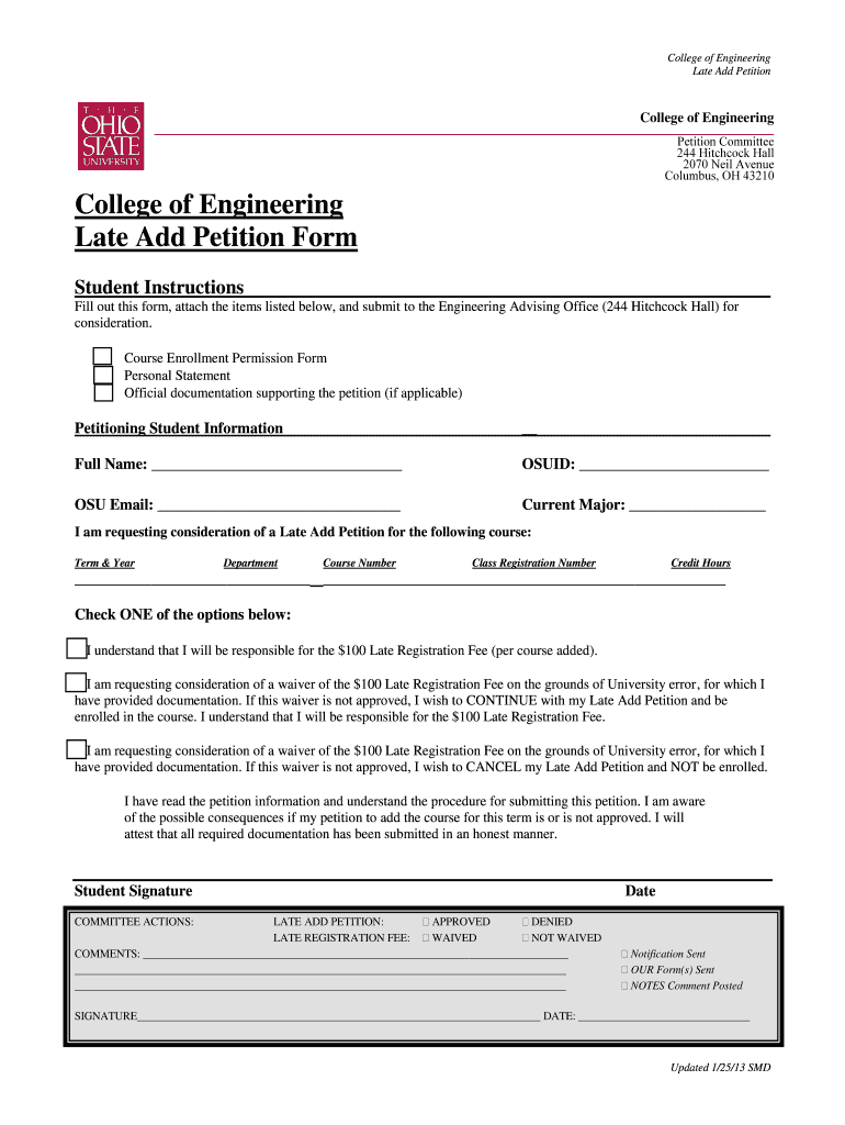 College of Engineering Late Add Petition College of Engineering Petition Committee 244 Hitchcock Hall 2070 Neil Avenue Columbus, OH 43210 College of Engineering Late Add Petition The Ohio State University