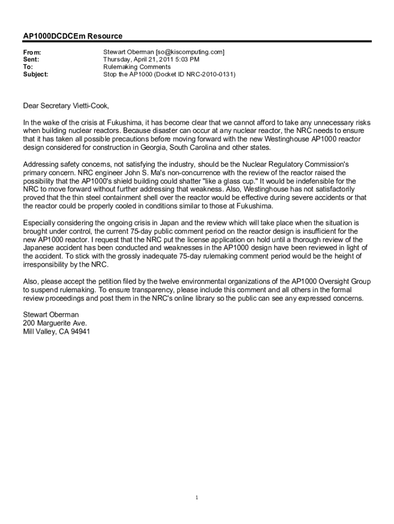 Get the free 2011/04/22 - Comment (5184) Form E-mail regarding the AP1000 Design Certification Am...