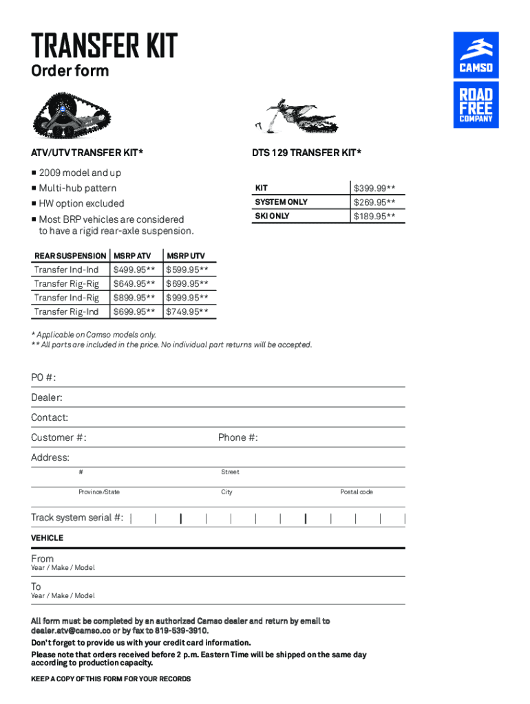 TRANSFER KIT Order formats 129 TRANSFER KIT×ATV/UTV TRANSFER KIT* 2009 model and up Multi hub patternKIT$399.99** HW option excludedSYSTEM ONLY$269.95** Most BRP vehicles are considered to have a