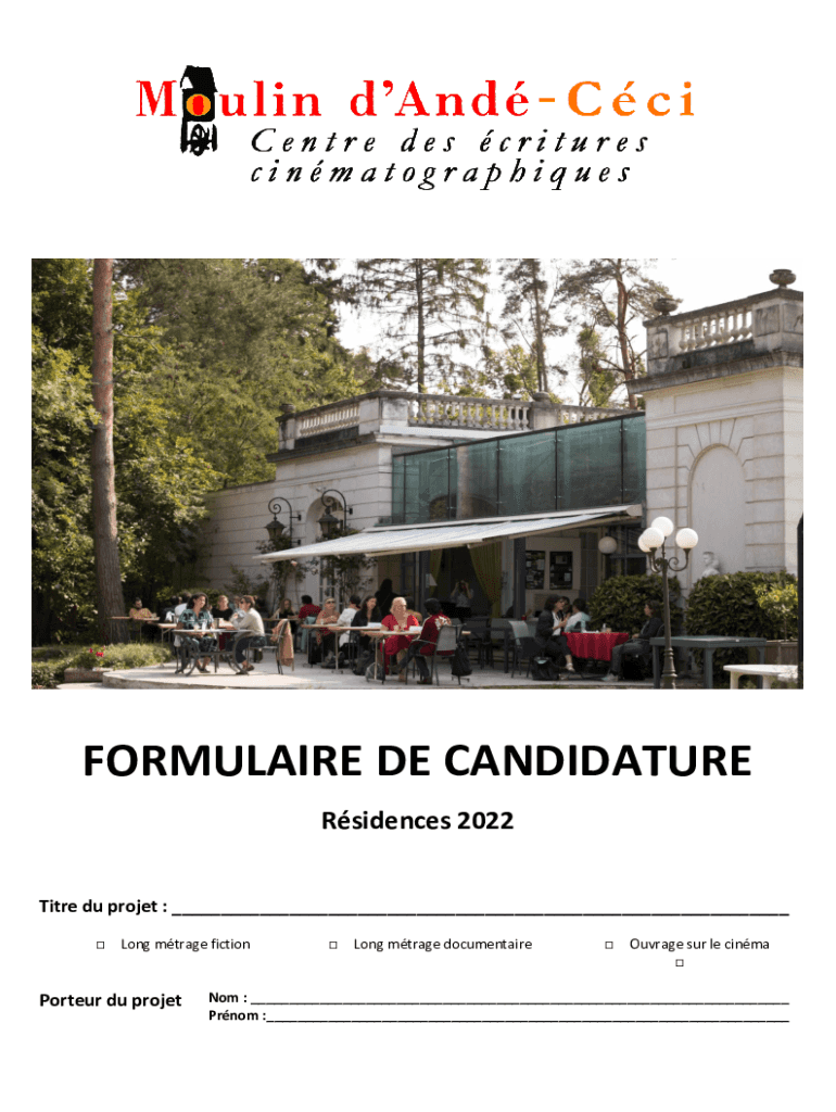 FORMULA IRE DE CANDIDATURE Residences 2022 Title Du project : ___ Long mirage fictionPorteur Du projection mirage documentaireOuvrage SUR LE cinema Not : ___ Prom :___NOTICE A lire attentivementNature